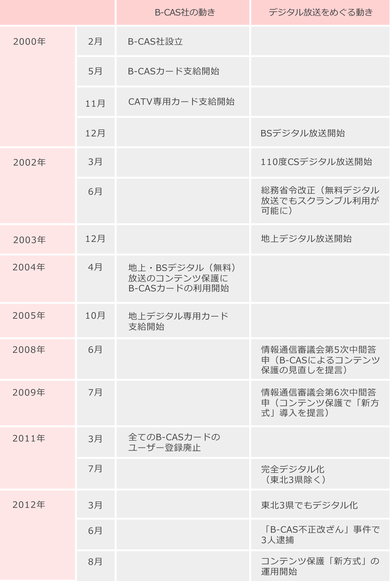 | 2008年 | 6月 | 情報通信審議会第5次中間答申(B-CASによるコンテンツ保護の見直しを提言) | |