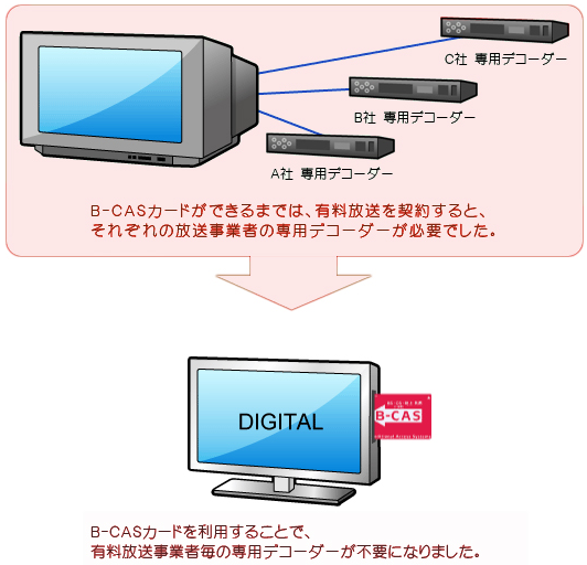 B-CASカードは受信機メーカーでデジタル放送受信機に同梱され、視聴者の元に届けられています。これによって有料放送に加入しても、専用のデコーダーを使用することなく、サービスを受けることができます。