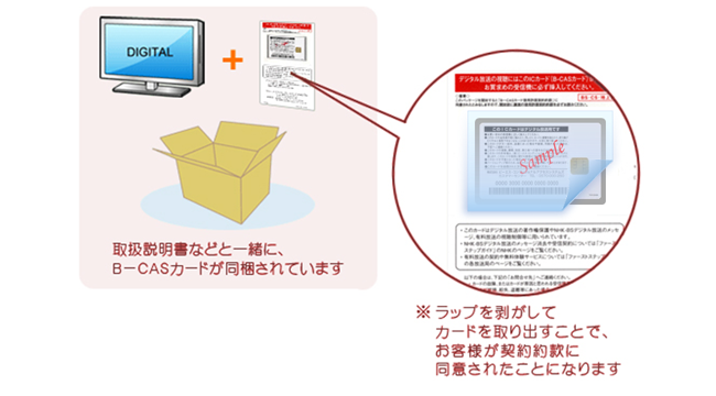 テレビやレコーダーなどの受信機を購入されると、取扱説明書などと一緒に、B-CASカードが同梱されています。B-CASカードは契約約款と共に台紙にシュリンクラップされており、ラップを剥がしてカードを取りだすことで、お客様が契約約款に同意されたことになります。B-CASカードは、システムのセキュリティの観点から、所有権が弊社に帰属しています。この、契約約款の主旨は、カードの不正使用や改竄の防止などが主な目的で、一般の視聴に使用されている限りは、契約上の問題が起きることはありません。